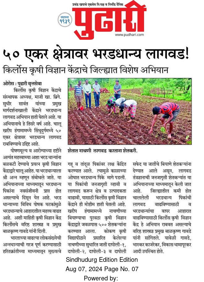 The Krishi Vigyan Kendra (KVK), Kirlos has been established by Sindhudurg Zilha Krishi Pratishthan, Kirlos under the sponsorship of Indian Council of Agricultural Research, (ICAR) New Delhi. KVK act as a frontline extension model at district level, has showcased frontier technologies, develop the capacity of different stakeholders, front runners in technology application. KVK has shown its visibility and presence in the Sindhudurg district. KVK is implementing several special programs launched through central and state governments. Cluster frontline demonstrations, climate resilient technologies, quality seed and planting materials production, farmer centric approach, nutria-sensitive agriculture, attracting and retaining youth in agriculture, post harvest processing and value addition, skill development, organizing farmers, identifying farm innovations etc. are being given major focus. Doubling farmers’ income through district specific strategy is taken on priority. Linkage and conveyance with concerned departments is also strengthened. A large number of extension activities are being organized by KVK in the district. KVK is actively involved in production of quality seeds, planting materials, livestock, bio-products and supplying them to the needy farmers.